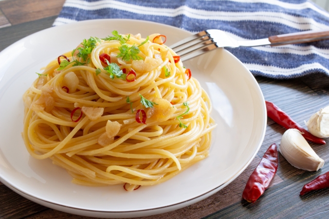ガーリックの香りを最大限に生かすには、「焦がさずに炒める」ことが鉄則です。スライスやみじん切りにしたにんにくを、冷たい状態のオリーブオイルからじっくりと弱火で加熱することで、香りがオイル全体に移り、まろやかで深みのある香りになります。さらに、生パスタをソースと一緒にフライパンで和える“乳化”の工程を加えると、ガーリックの香りとパスタが一体となり、最後のひと口まで風味が持続します。